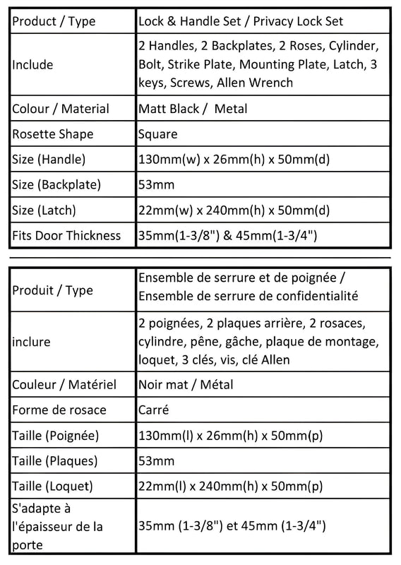 Matériau : Métal Couleur : Noir mat Forme de la rosace : Carrée Dimension Loquet 22mm(w) x 240mm(h) x 50mm(d) Poignée 130mm(w) x 26mm(h) x 50mm(d) Plaque arrière 53mm Convient à la porte Épaisseur 35mm(1-3/8") & 45mm(1-3/4") Remarque : Le loquet peut être utilisé pour les portes anti-tempête. |